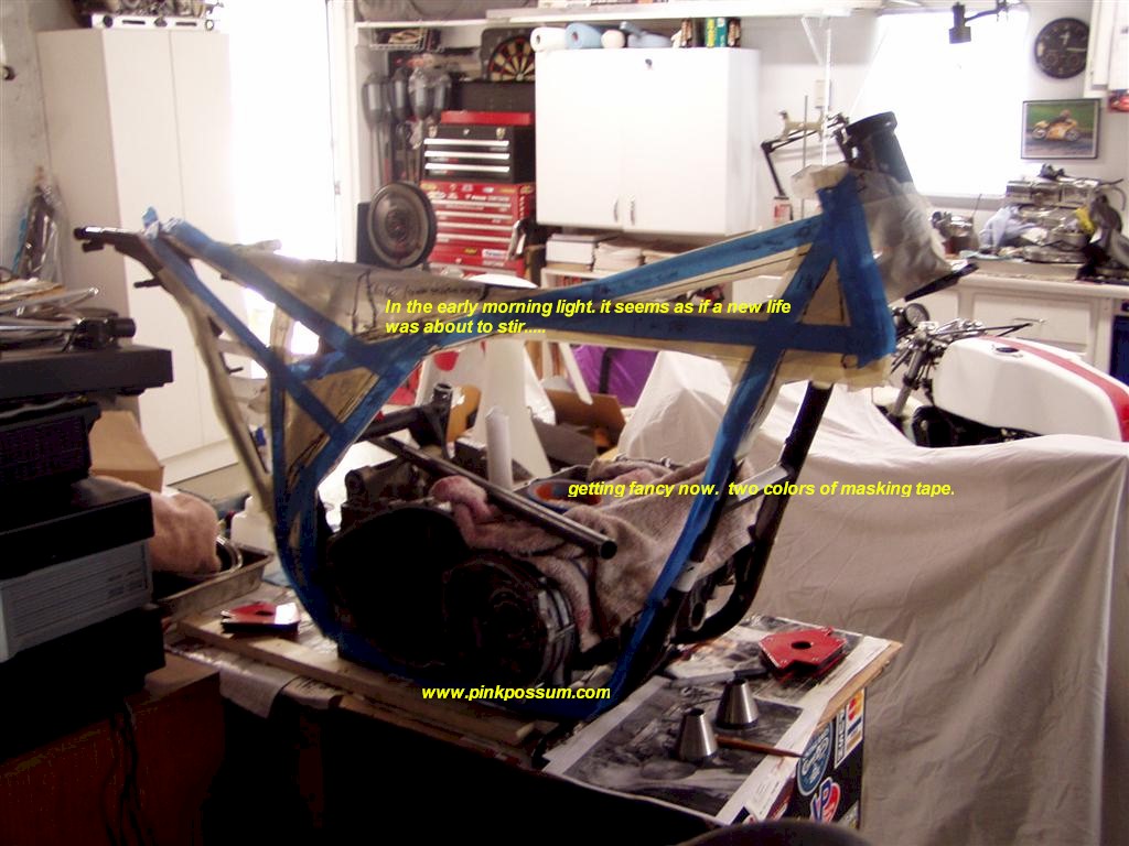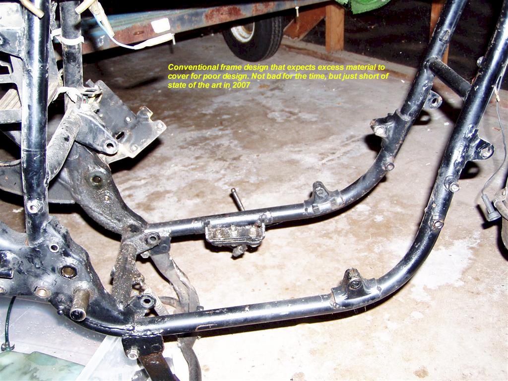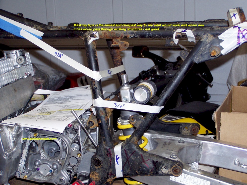 After a roll or two of tape, the shape was starting to appear and so were the solutions to some of the frame design problems. Of course, anyone with a regular brain would have realized that most of this mental exercise was not necessary. Wider rims on stock hubs with a pair of CBR600F2 calipers on CBR600F4 disks, using a stock frame and swingarm, would have been perfectly adequate for the purpose - and probably a whole lot cheaper.