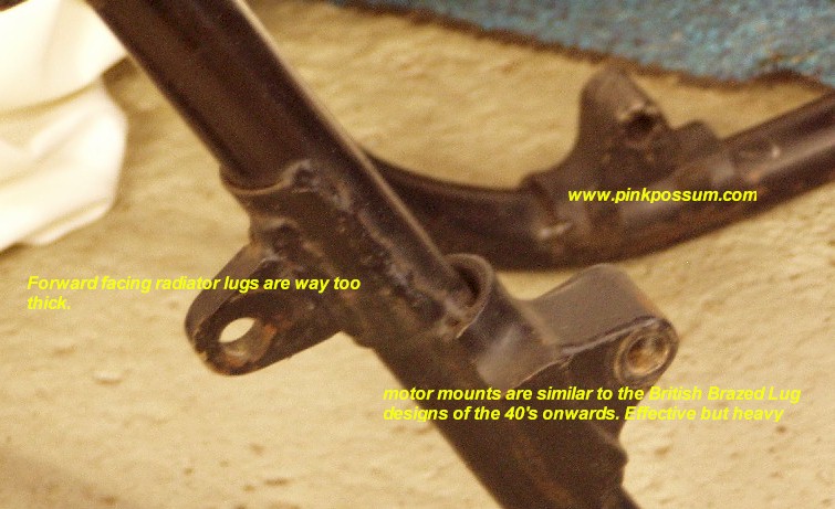 Motor mounts followed conventional British lug design, but updated from brazing to welded. Incredibly heavy cast lugs were welded to the frame tubes. They are actually well designed and were welded along the center line of the frame tubes. Good engineering design, but so heavy.