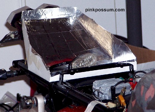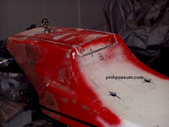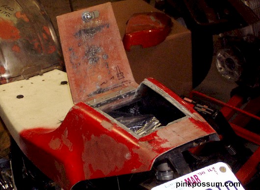 Holes were drilled to take OEM type rubber mounts so the seat can be bolted securely without too much cracking. The seat was starting to look good, but all that's a very big hump with nothing much under it. I did not want to position the battery or oil tank back there. All that weight up high is not good for handling, so what could I use the space for? The answer is obvious - Storage. we all need somewhere to put the registration and Insurance papers and perhaps a spare bottle of 2 stroke oil or a pack of sandwiches and a mobile phone. The next question was would I make a tray that required the whole seat to be lifted off, or was there a simpler way to put some sort of "door" in. I liked the idea of a hidden door in the front face of the hump to be hidden behind the seat pad, but that area is too shallow to be useful. So that meant I needed to cut a hatch in the top surface and find a way to open it and make it blend in so that it's not too noticeable.