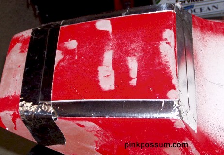 The obvious answer was to stretch the hump by a couple of inches. In theory that is quite simple, but things never quite work out the way they are supposed to. I cleaned up the lower surface of the seat so that the new fiberglass would be able to get a grip. Then I used Aluminum duct tape and stiff card to build up an extension to the existing hump. The hump was extended using fiberglass mat and cloth, let it dry and trimmed it with a Dremmel cut off wheel. After that followed the inevitable filling in pits and low spots and rubbing it down, and filling and rubbing etc until it was close to the shape I wanted.